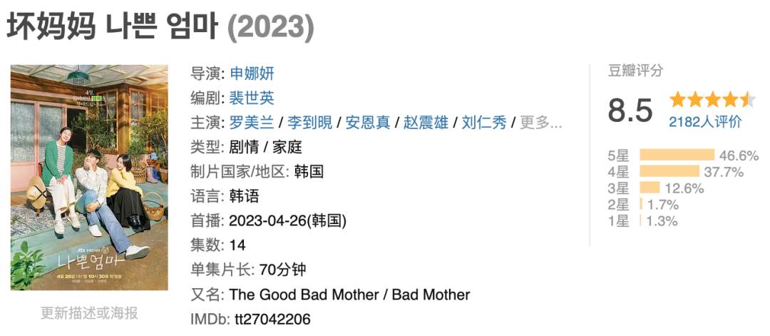 目前豆瓣評分8.5,口碑在本季上新韓劇中很靠前。