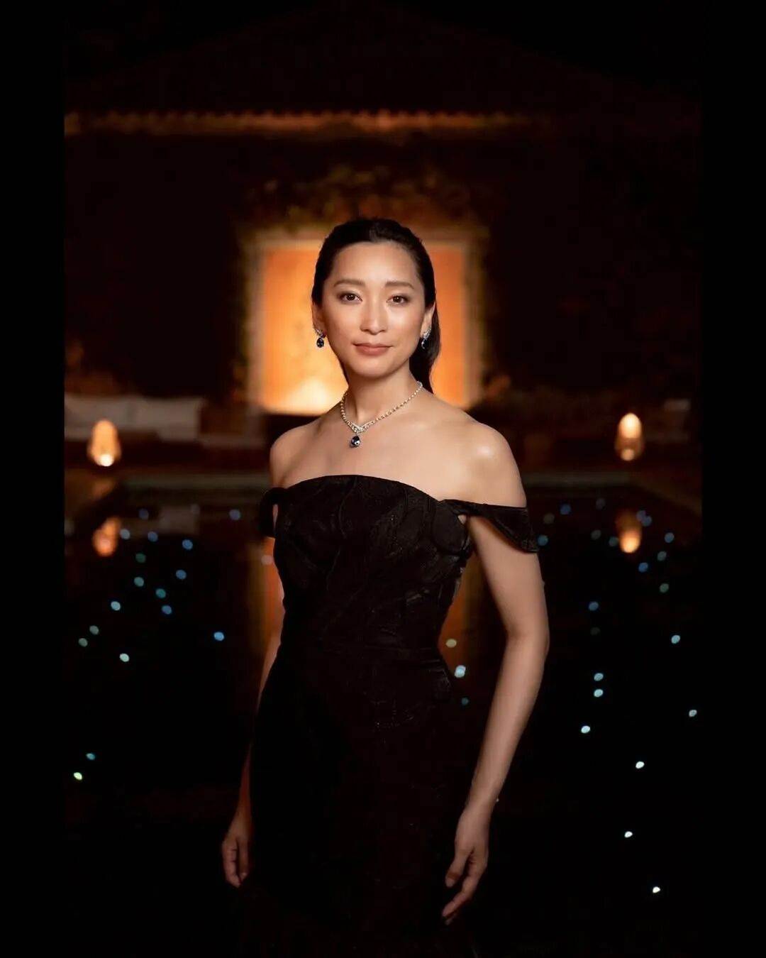 一組在西班牙馬拉加拍攝的照片里,她身著露肩黑色禮服,梳起利落發髻,頸間的藍寶石光芒流轉。