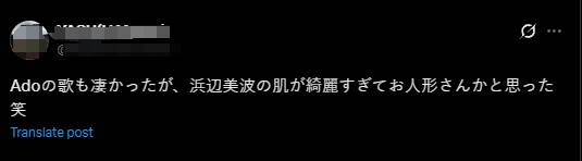 「Ado的歌也很厲害,不過濱邊美波的皮膚實在是太漂亮了,我還以為她是個洋娃娃呢哈哈」▽