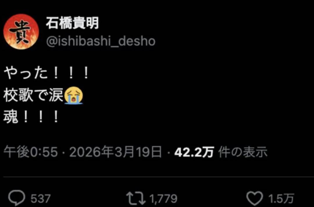 「やった!!校歌で涙。魂!!!(太好了!!聽到校歌都哭了。靈魂都被點燃了。)」