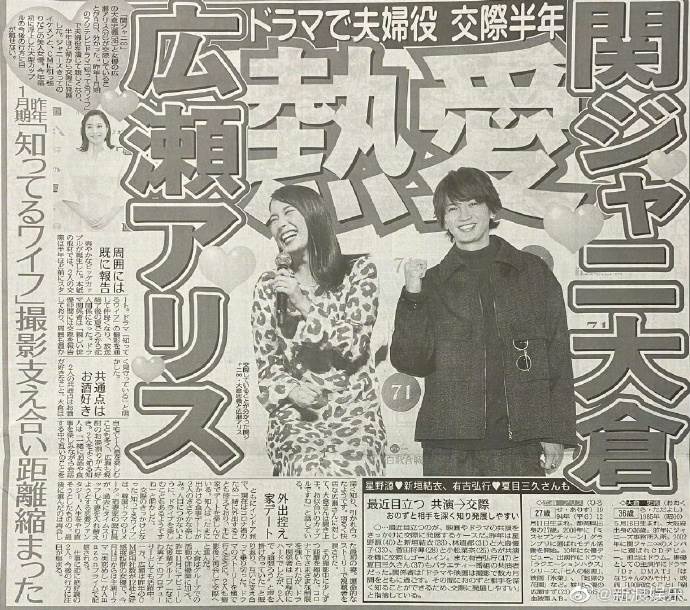 對此廣瀨反而覺得新鮮,越發被其吸引。而去年12月與黑木明紗(36歲)離婚后的赤西,雖曾被《FRIDAY》曝與好友錦戶亮(40歲)夜游并帶混血美女回家,但自與廣瀨交往后徹底收心,可見認真程度。