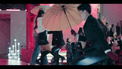 保鏢穩步上台,撐開黑傘。