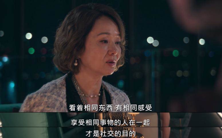 她是個典型的比上不足、比下有余的中產精英。在真正的老錢財閥面前,她只能卑微地坐在聚會一角。